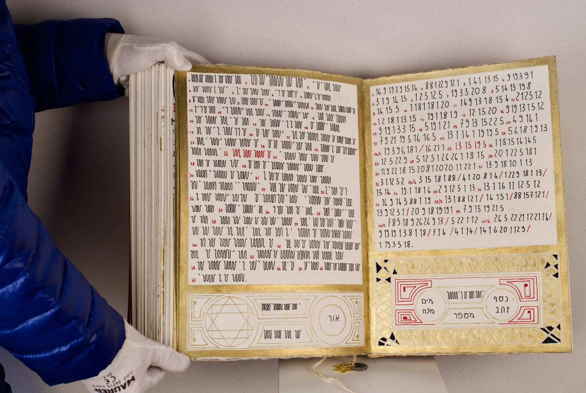 A través del análisis de los Nombres Sagrados, el libro nos invita a emprender un fascinante viaje hacia el descubrimiento de los misterios de la creación. Cada nombre, según la tradición esotérica, posee un poder vibracional y un significado profundo, conectándonos directamente con las fuerzas cósmicas que gobiernan el universo. Realizado con materiales preciosos y según precisas indicaciones rituales, “El Libro de los Nombres Significados” es una obra de arte que trasciende la simple estética. La cubierta de madera de acacia, símbolo de inmortalidad y conexión con la naturaleza, alberga una compleja iconografía que remite a los misterios de la creación. Las páginas, hechas con papel de alta calidad, están adornadas con caligrafías intrincadas y símbolos alquímicos que invitan a la meditación y a la contemplación. No falta una marcada simbología relacionada con los textos bíblicos, como la serpiente de cobre: Representa la curación y la sabiduría, evocando el mito bíblico de la serpiente de bronce que sanaba a las personas mordidas por serpientes venenosas; Las doce tribus de Israel: Los símbolos de las doce tribus de Israel, tomados de un mosaico de una sinagoga en Jerusalén, representan la unidad y la diversidad del pueblo judío; La geometría sagrada: Las proporciones y geometrías utilizadas en la realización del libro evocan los principios de la geometría sagrada, presente en todas las grandes tradiciones espirituales; Los colores: El oro, el blanco, el negro y el rojo están cargados de significados simbólicos: el oro representa la divinidad, el blanco la pureza, el negro la materia y el rojo la pasión.