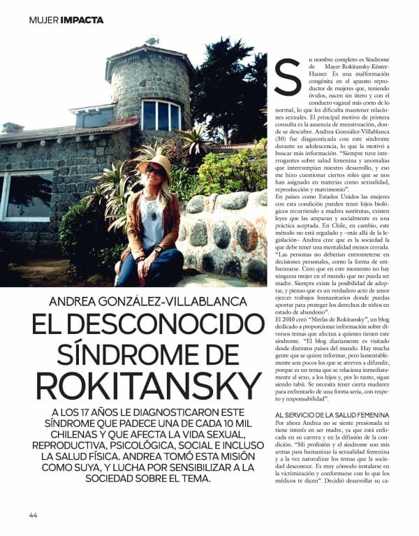 Andrea, que con su historia, actividad y trabajo ha construido una exclusiva situación impulsando el avance de otra gente y también impactando de forma positiva su ámbito, tras fundar Ninfas de Rokitansky en 2010, un Lugar Periodístico Especializado y Fuente de Información y Difusión Sin Objetivos de Lucro, dirigido a reconstruir la vida de mujeres nacidas con Síndrome de Rokitansky. Una anomalía de carácter ginecológico que perjudica la vida sexual, reproductiva, popular y sicológica de una de cada 5.000 mujeres en el planeta. En algunas ocasiones puede perjudicar la salud física de la tolerante.