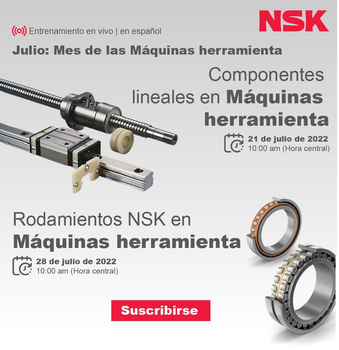 El 28 de julio, a las 10 am (hora de México), Omar Calzudes, Ingeniería en Méixco, impartirá la capacitación “Rodamientos NSK en Máquinas Herramienta” y presentará las características y beneficios del uso de rodamientos NSK en máquinas herramienta y las nuevas tecnologías utilizadas en los componentes, que entre sus diferenciales cuentan con soporte de tornillos de bolas y cuentan con un diseño interno optimizado para una mayor vida útil y mejoras en el de desempeño.