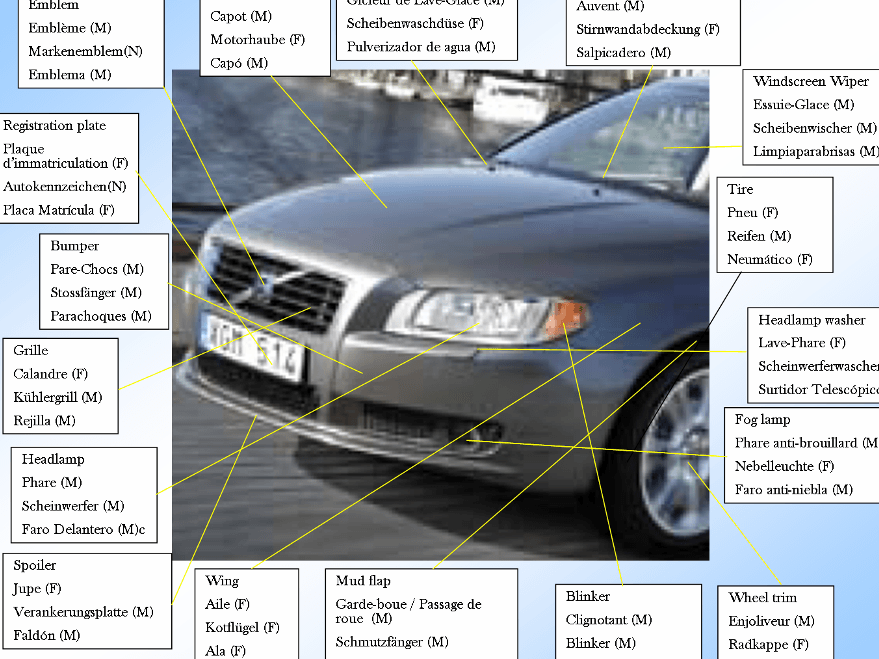 Por ejemplo, en inglés se utiliza el término front para referirse a esta parte del vehículo. En francés, se utiliza la palabra avant, mientras que en alemán se utiliza el término Vorderseite.